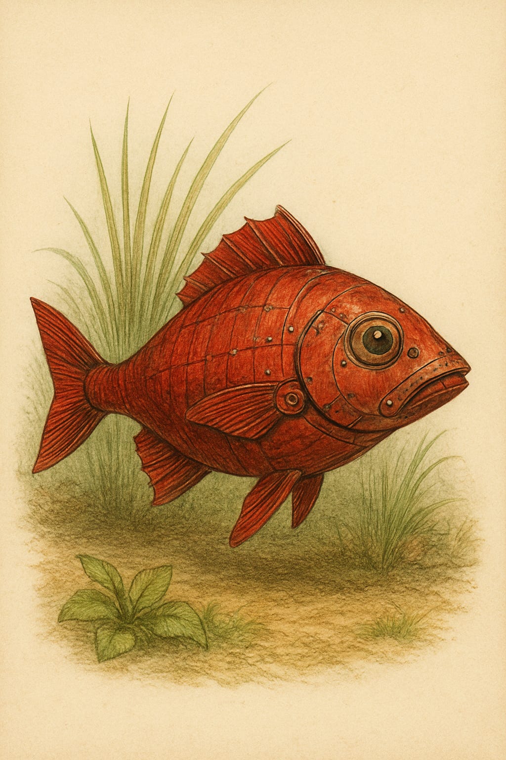 Prompt: Draw a robot red herring in the style of Audubon